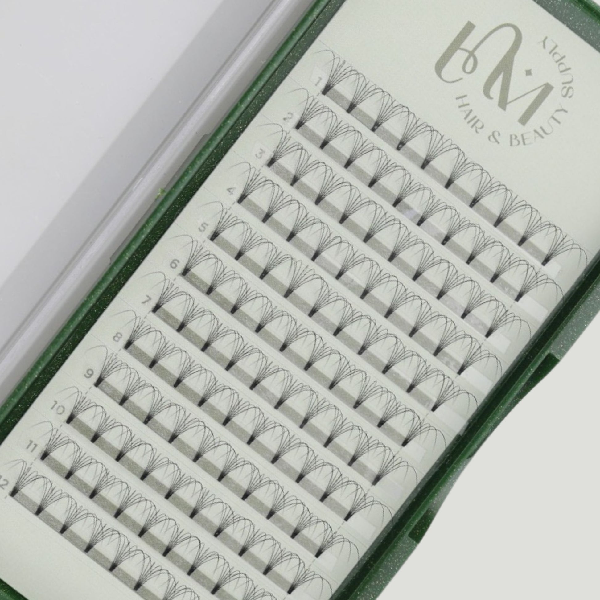 These Premade Volume Lash Fans in 0.07 thickness and D curl (13mm) by LNM are designed for easy and fast application, delivering a full, voluminous lash look. Each fan is perfectly symmetrical with a slim base for seamless bonding. Made from high-quality synthetic fibers, they offer a lightweight, soft feel while maintaining durability. Professional quality, made for lash artists.
