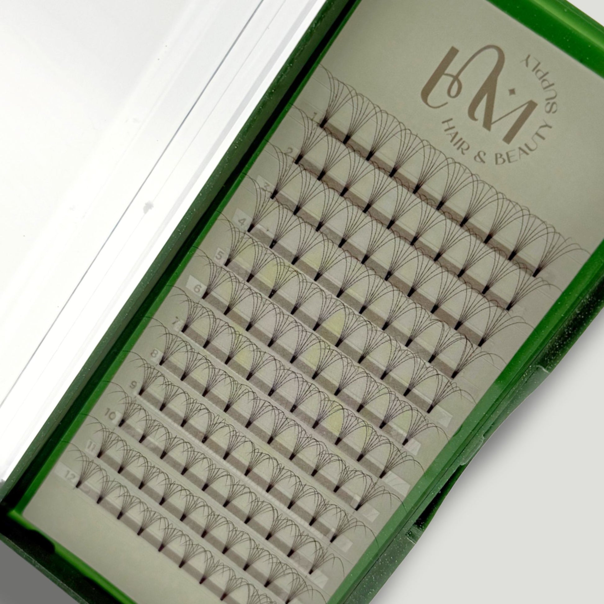These Premade Volume Lash Fans in 0.07 thickness and D curl (14mm) by LNM are designed for easy and fast application, delivering a full, voluminous lash look. Each fan is perfectly symmetrical with a slim base for seamless bonding. Made from high-quality synthetic fibers, they offer a lightweight, soft feel while maintaining durability. Professional quality, made for lash artists.