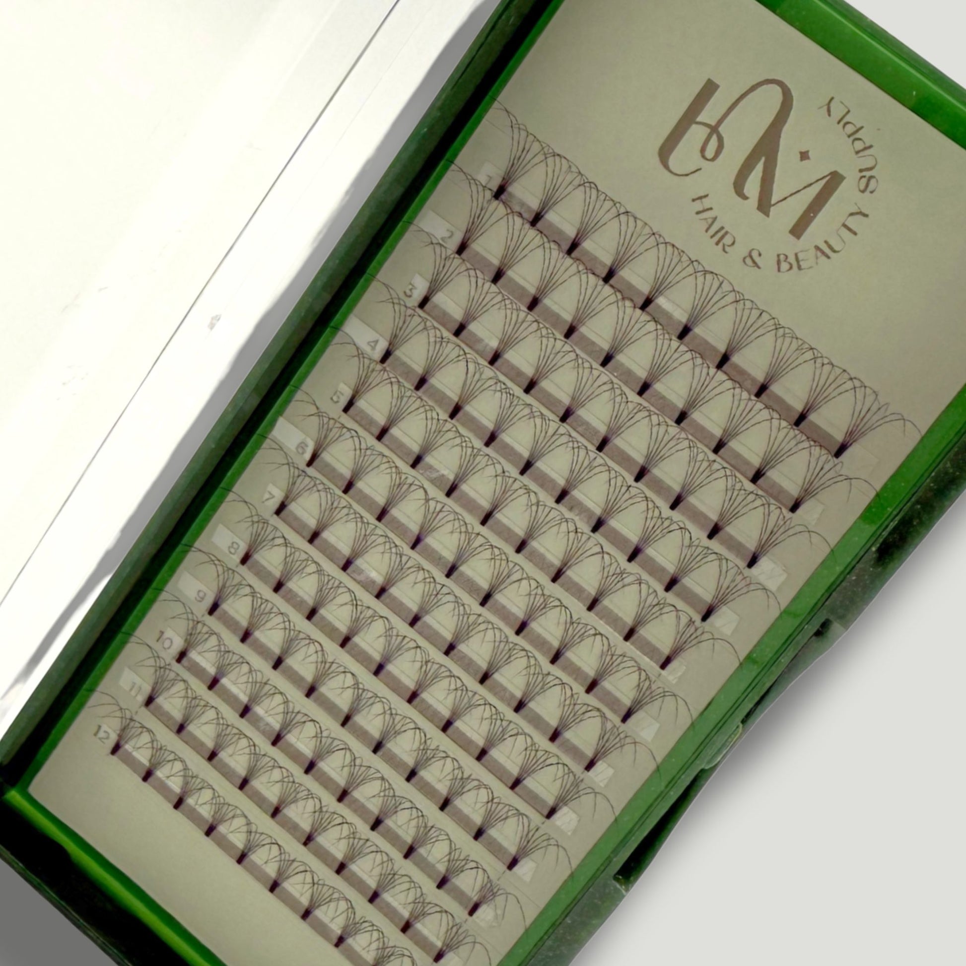 These Premade Volume Lash Fans in 0.07 thickness and D curl (15mm) by LNM are designed for easy and fast application, delivering a full, voluminous lash look. Each fan is perfectly symmetrical with a slim base for seamless bonding. Made from high-quality synthetic fibers, they offer a lightweight, soft feel while maintaining durability. Professional quality, made for lash artists.