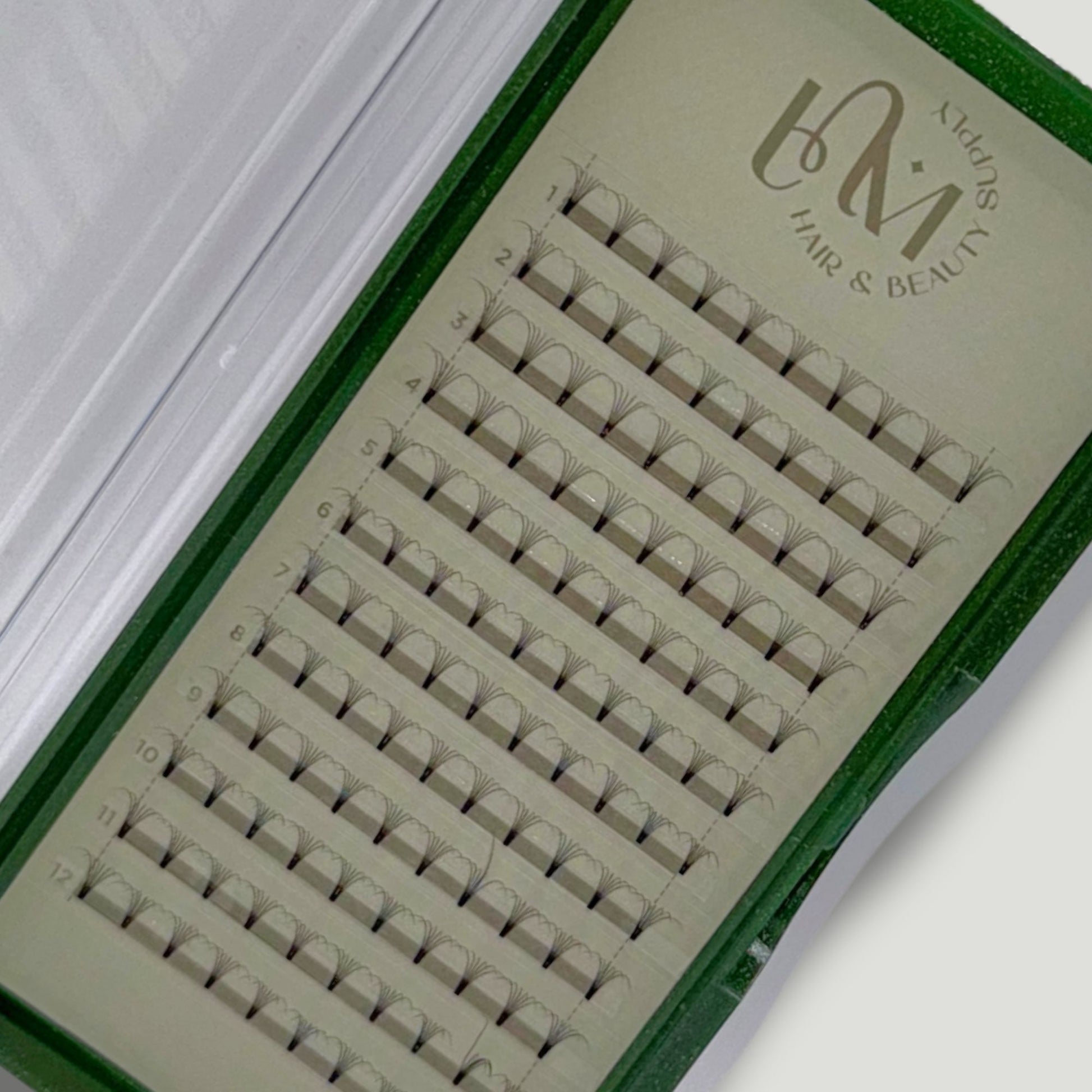 These Premade Volume Lash Fans in 0.07 thickness and D curl (8mm) by LNM are designed for easy and fast application, delivering a full, voluminous lash look. Each fan is perfectly symmetrical with a slim base for seamless bonding. Made from high-quality synthetic fibers, they offer a lightweight, soft feel while maintaining durability. Professional quality, made for lash artists.