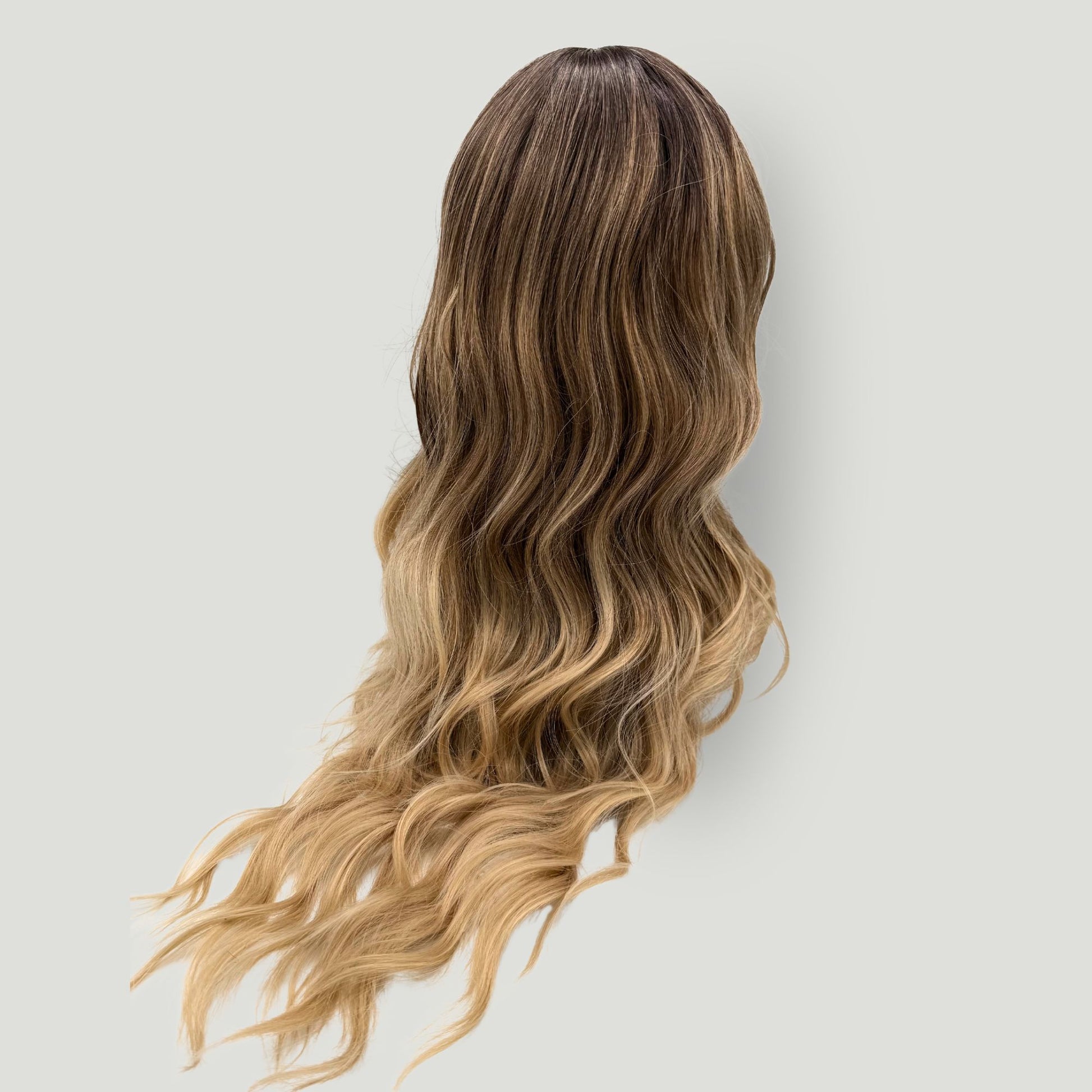 03- Long Wavy Synthetic Wig with Bangs – Dark Root & Honey Blonde