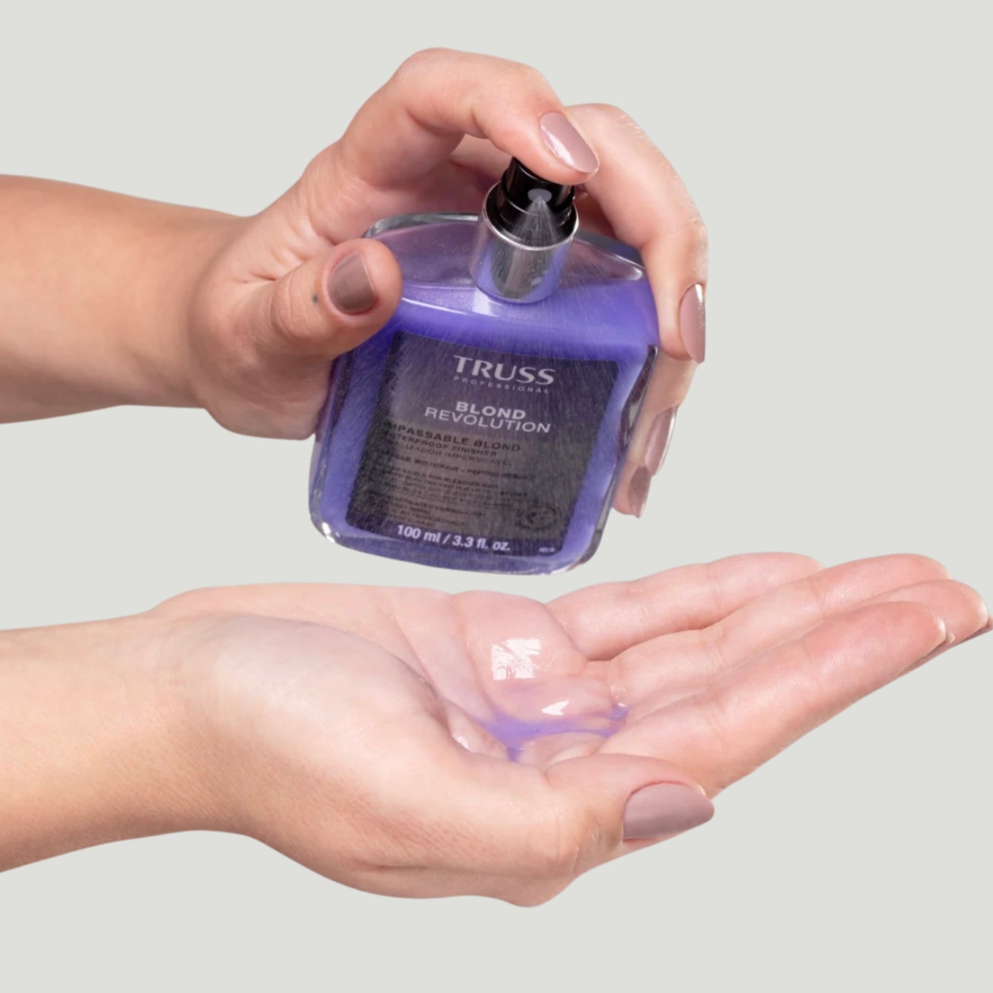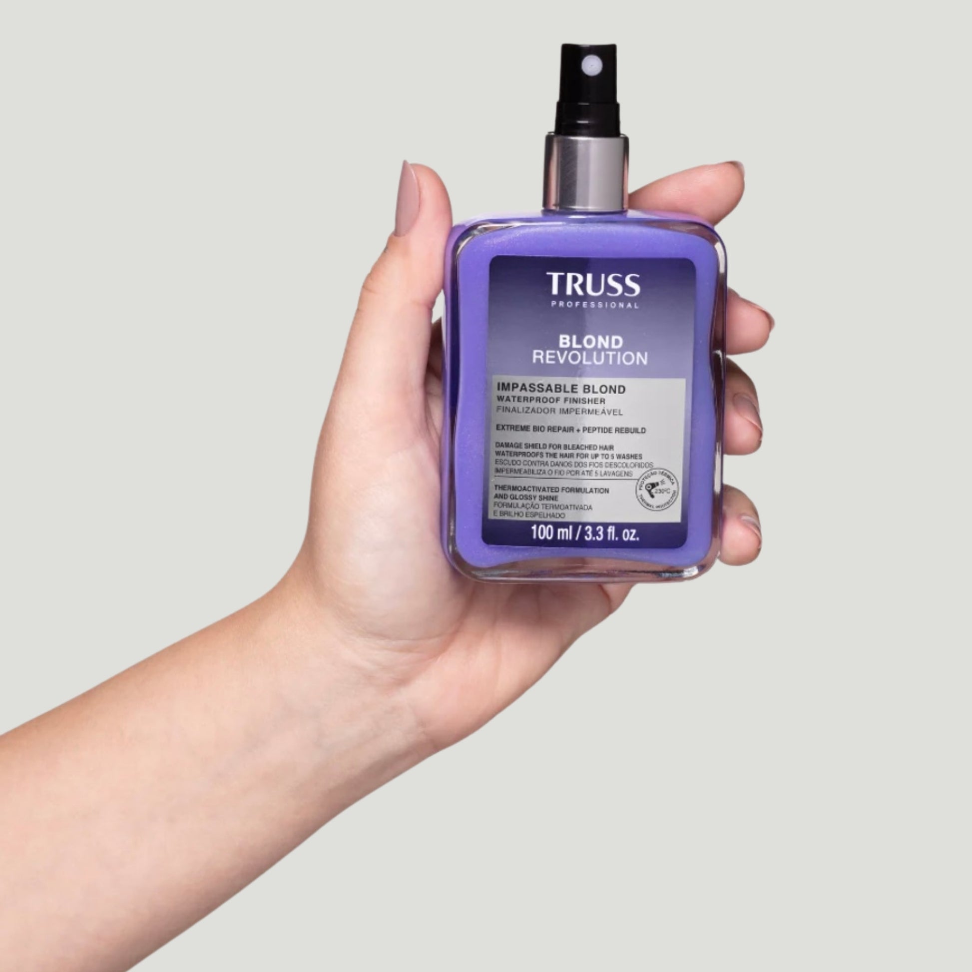 Truss Blond Revolution Impassable Blond is a waterproof finisher designed for bleached and fragile blonde hair. With advanced bio-repair technology and peptide rebuild action, it creates a protective shield that lasts up to 5 washes. This thermoactivated product enhances shine, seals cuticles, and boosts softness without weighing the hair down. Professional quality, made in Brazil.