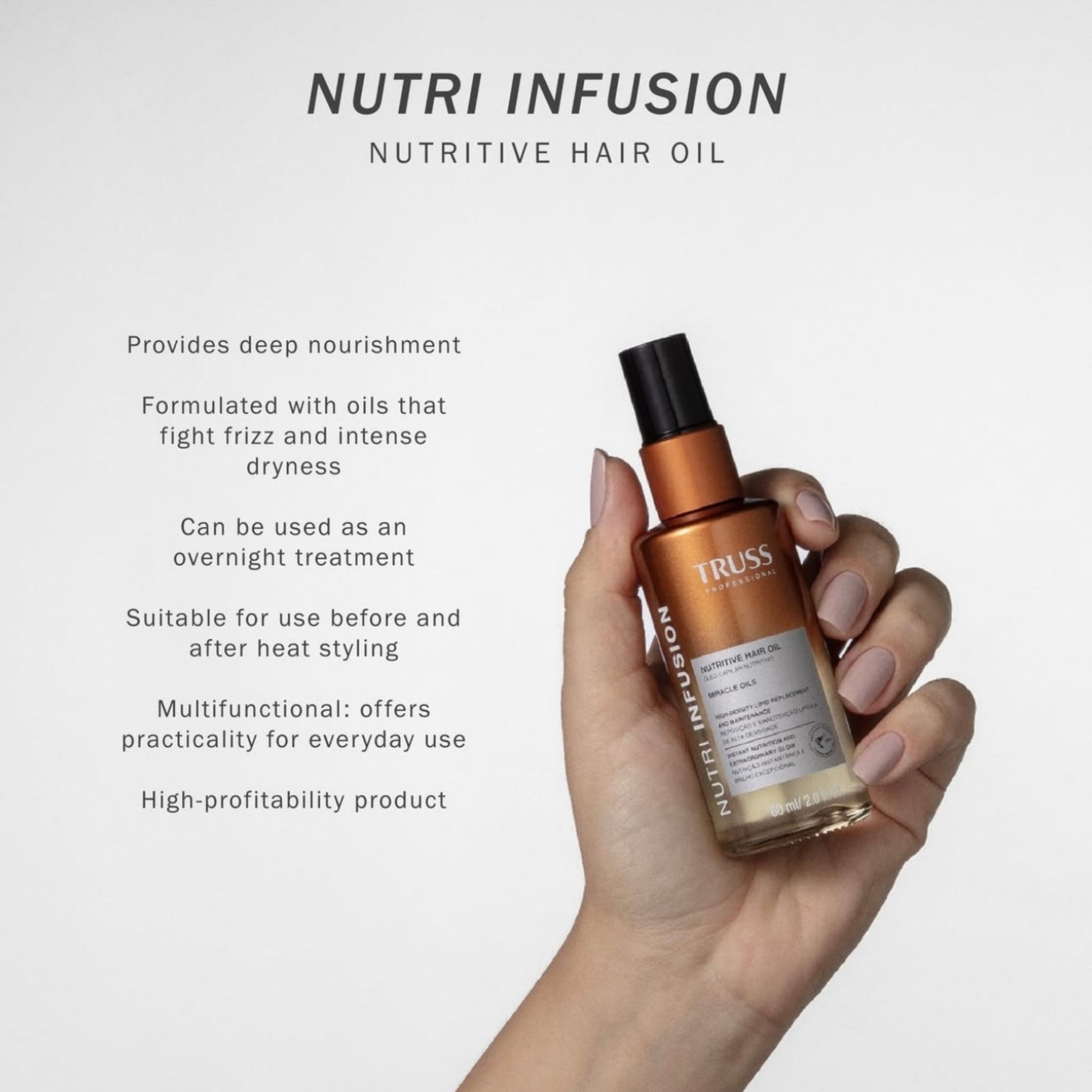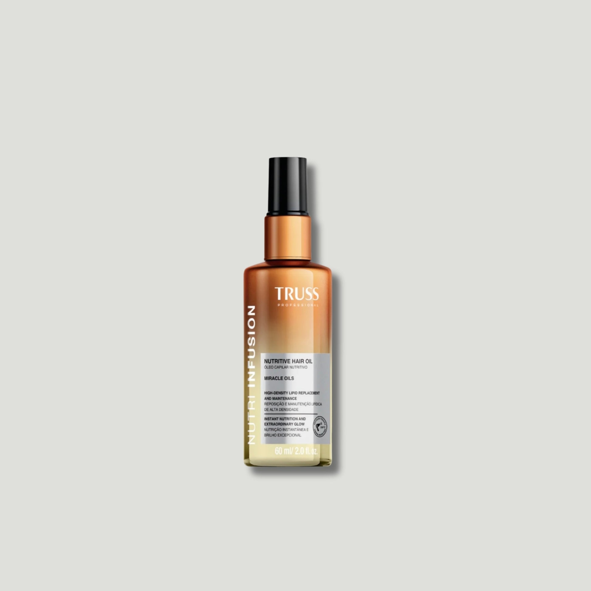 Truss Nutri Infusion Nutritive Hair Oil is a professional finishing oil enriched with miraculous oils to restore hair’s lipid barrier and boost softness and shine. Its high-density lipid replacement formula deeply nourishes, reduces frizz, and protects hair from external damage. Ideal for dry, dull, or chemically treated hair. Professional quality, made in Brazil.